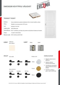 Välioven toimitukseen sisältyy ovilehti, lukkorunko ja kiinnitysruuvit karmin saranoihin. Toimitukseen ei automaattisesti kuulu välioven karmia, kynnystä, painiketta ja peite-/avain- tai WC-helaa, vaan ne on ostettava erikseen.