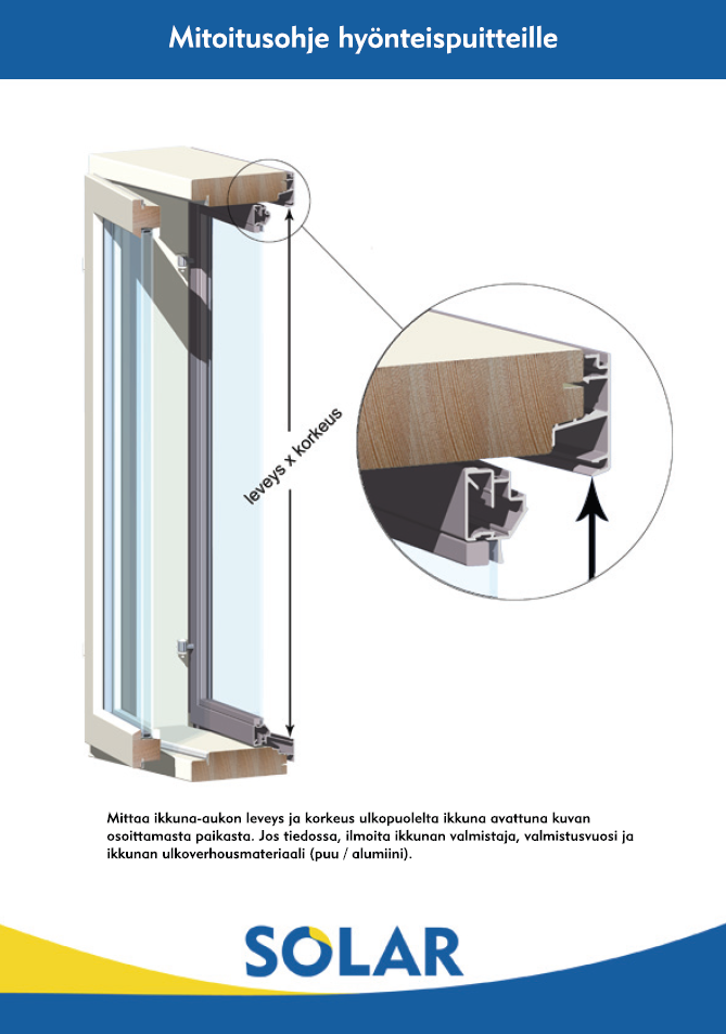 Avaa ikkunan molemmat pokat ja mittaa ikkuna-aukon alumiini-/puuverhouksen sisämitat leveys ja korkeus. Jos on tiedossa, niin ilmoita myös ikkunoiden valmistaja ja valmistusvuosi. Hyttyspuitteen kehyksen värin voit valita mieltymyksesi mukaan.