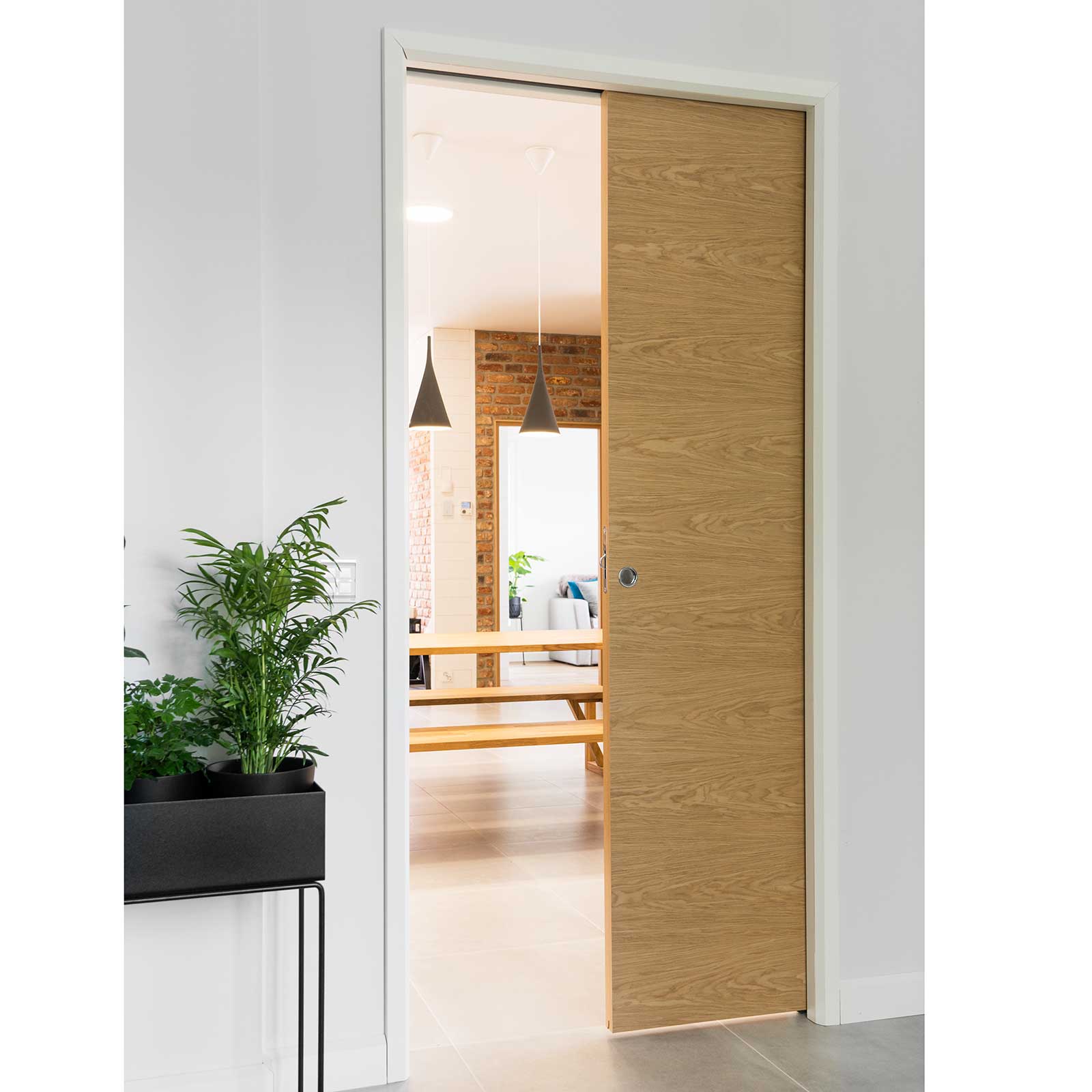 Liukuovirunko on täydellinen oviratkaisu minimalistiselle sisustajalle, sillä avattu ovi kätkeytyy seinän sisään vapauttaen sekä seinä- että lattianeliöitä muuhun käyttöön.