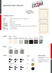 Laadukkaat Craft-väliovet on viimeistelty maalaamalla. Sisäovet on maalattu puolihimmeällä alkydimaalilla (kiiltoaste 25). Vakiovärinä käytetään valkoista NCS S 0502-Y ja muita perusvärejä ovat puhtaanvalkoinen NCS S 0500-N, musta NCS S 9000-N, harmaa NCS S 5500-N, helmenharmaa NCS S 1502-G50Y ja tummanharmaa NCS S 7502-B. Oven voi myös tilata omalla NCS S-värillä.