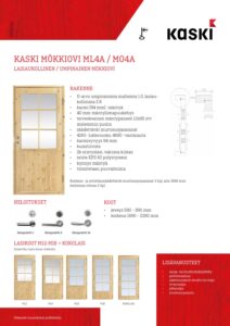 Kaskipuun valmistamat ML4A- ja MO4A-mökkiovet ovat olleet vuosikymmeniä suomalaisten suosikkivalinta kolmen vuodenajan mökeille ja loma-asuntoihin. Lisäksi paneeliovet ovat loistava valinta myös kylmänvaraston tai pihasaunan ulko-oveksi. ML4A-mökkiovet valmistetaan kestävästä männystä, joka on perinteisesti käytetty rakennusmateriaali mökkirakentamisessa. Oikein huollettuna mökkiovet ovat pitkäikäisiä ja soveltuvat erinomaisesti suomalaiseen mökkimaisemaan.