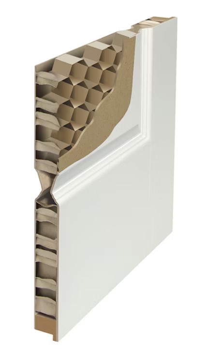 Kennorakenteinen 40 mm vahva huullettu ovilevy. Ovilevyssä 2 kpl rampamuhviruuveja symmetristen saranoiden kiinnitystä varten.