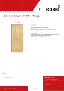 Kaski-paneeliovet valmistetaan Suomessa nykyaikaisella teknologialla ja korkealaatuisista, testatuista materiaaleista. Valmistusprosessissa painotetaan kestävää kehitystä ja ympäristöystävällisyyttä, joten jokainen ovi on sekä laadukas että vastuullisesti tuotettu. Oven massiiviliimapuurunko on 40 mm vahva. VO4AL ovessa ulkopuolen pintamateriaalina käytetään mäntypaneelia STV 12 x 95 mm ja sisäpuoli on paneloimaton ja oven kokonaisvahvuus on 52 mm. VO4AL on eristämätön ja tiivistämätön paneeliovi. VO4BL on eristetty versio varaston paneeliovista. Ovi on paneloitu ulkopuolelta mäntypaneelillla STV 12 x 95 mm ja sisäpuolelta vaneroitu 6 mm havuvanerilla. Oven kokonaisvahvuus on 57 mm. VO4BL-paneeliovessa on EPS-eristys ja 1-kertainen tiivistys karmissa.
